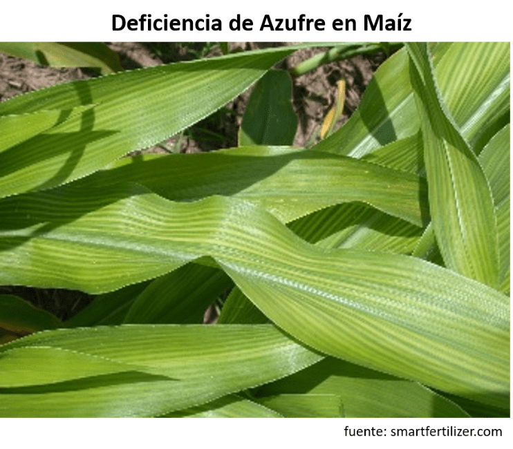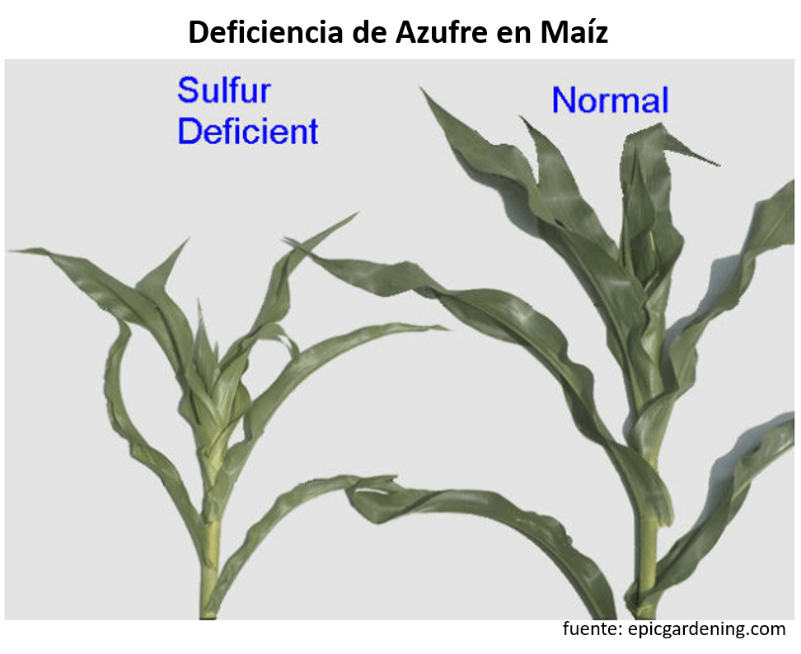 La deficiencia de Azufre en las plantas puede parecerse mucho a una deficiencia de Nitrógeno, con un efecto general de palidez y retraso del crecimiento. Sin embargo, ésta clorosis generalizada usualmente ocurre en las hojas jóvenes, mientras que el síntoma de una deficiencia de Nitrógeno aparece primero en las hojas más viejas. También hay una serie de signos de deficiencia específicos de la especie, entre ellos están, una pobre nodulación en el caso de leguminosas, frutos que no maduran completamente y el moteado en las hojas de las papas.