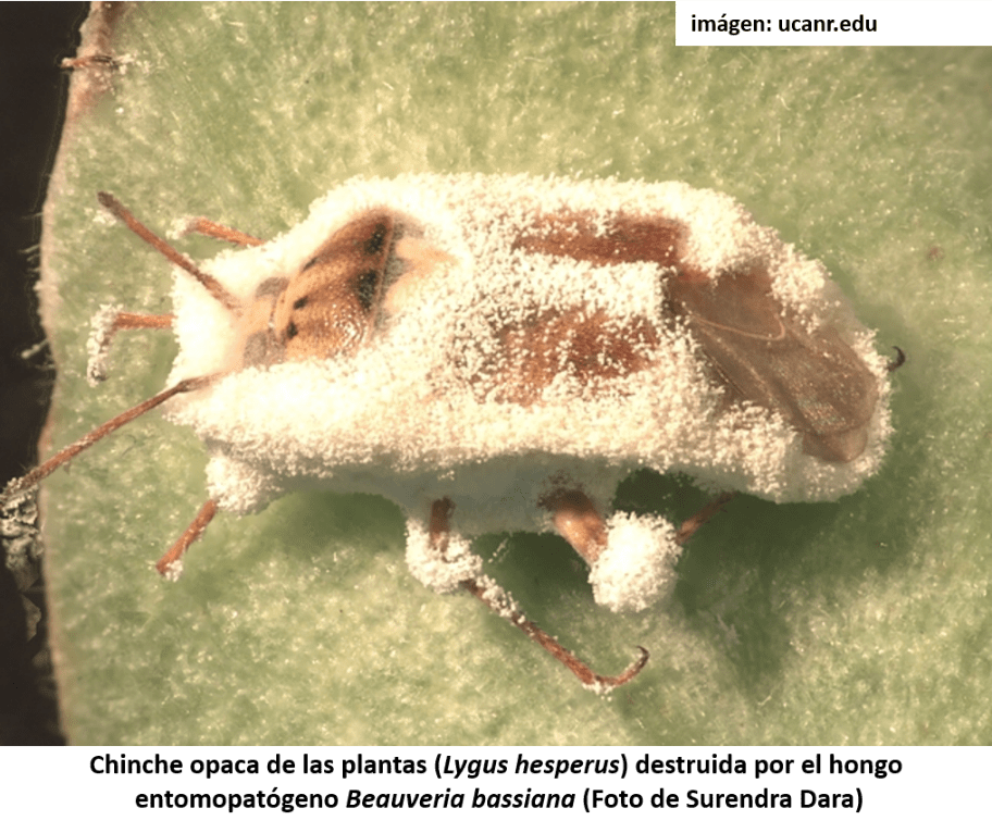 Tipos de patógenos que controla: Los productos comerciales que contienen diferentes cepas de Beauveria se etiquetan comúnmente para el control de insectos como trips, mosca blanca, pulgones, orugas, gorgojos, saltamontes, hormigas, barrenadores y escamas.
