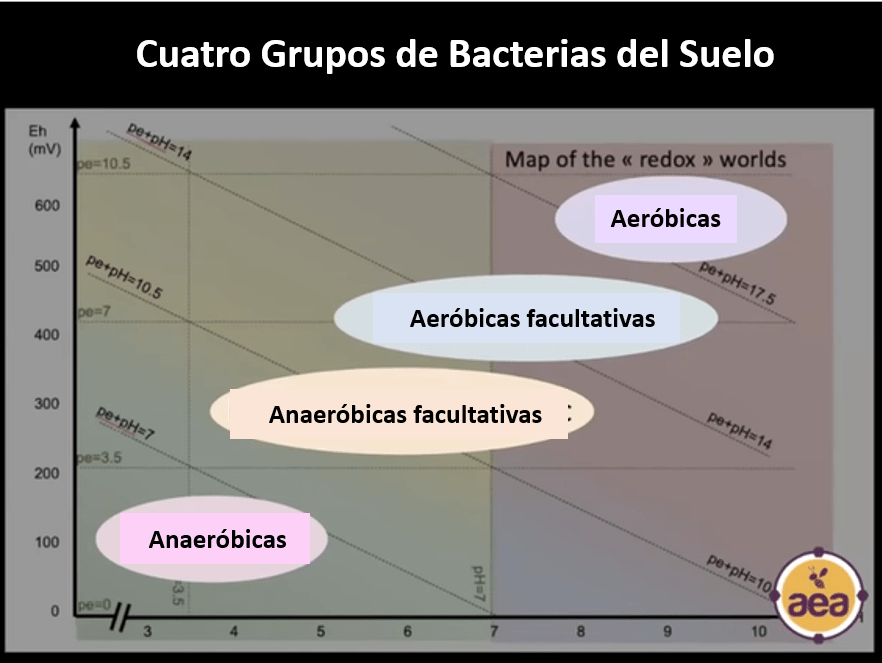 Las bacterias aeróbicas ubicadas en la parte superior derecha del grafico, son un elemento importante. Cuando son dominantes en un ambiente de suelo y están muy cerca del Manganeso, el Fierro, etc., absorben parte de estos minerales, la usan para sus propias células y la envían de regreso al entorno. Esta interacción microbiana tiene un claro efecto oxidante, por lo que otra forma de referirnos a bacterias aerobicas versus bacterias anaeróbicas es señalarlas como bacterias oxidantes versus bacterias reductoras.