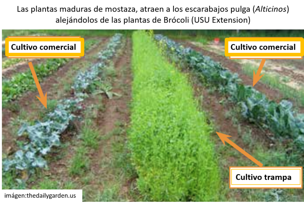 Los cultivos trampa se componen de una o más especies de plantas que se establecen para atraer insectos plaga a fin de proteger el cultivo comercial. La protección puede lograrse ya sea evitando que las plagas accedan al cultivo comercial o bien concentrándolas en una zona determinada en el campo, donde se pueden manejar. Los cultivos trampa se pueden manipular en el tiempo y/o en el espacio, por lo que pueden atraer insectos en un período crítico del ciclo de vida ya sea de la plaga o del cultivo.