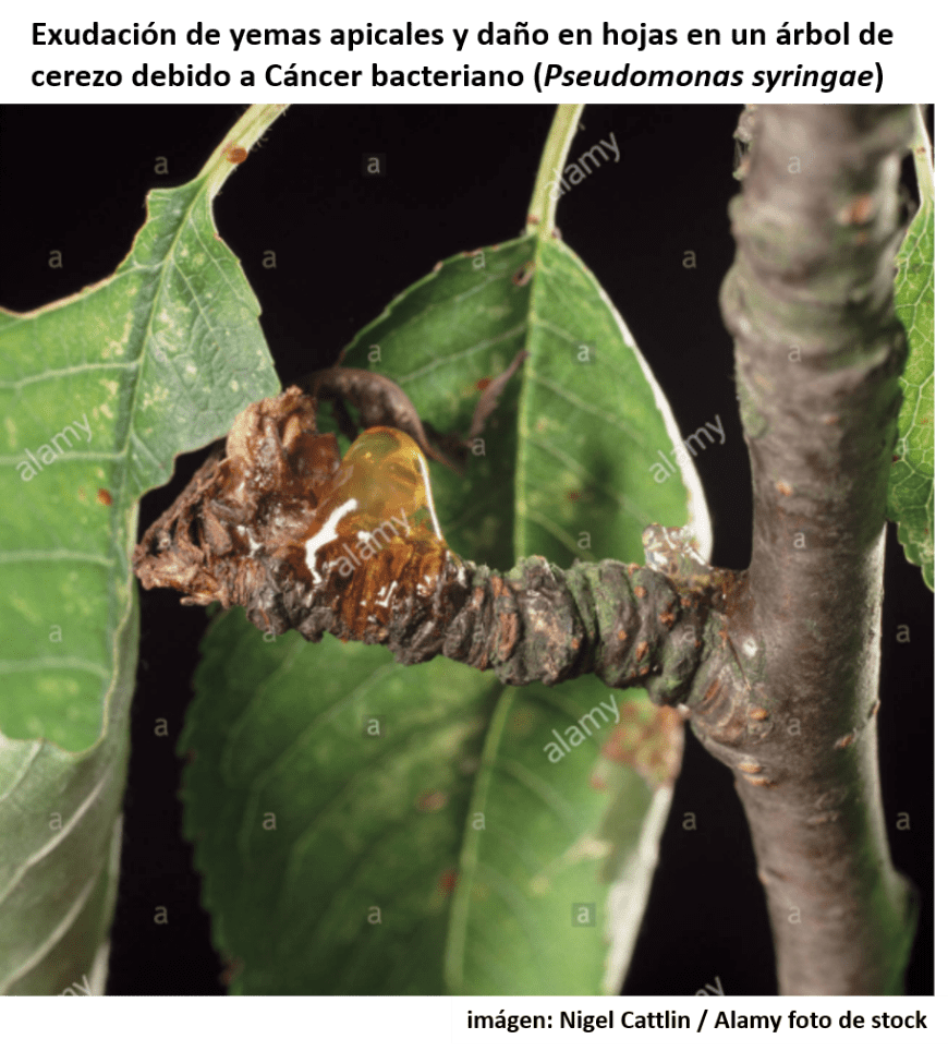 Cuando se presenta el Cáncer bacteriano en Cerezo, tenemos a Pseudomonas syringae que no es un patógeno específico del floema ni del xilema. Se encuentra en todo el tejido vascular, en toda la estructura del árbol y en el citoplasma como una infección bacteriana que se considera intratable. Este patógeno tiende a propagarse con mucha facilidad y rapidez, por lo que podemos eliminar el tejido dañado para tratar de evitar que el problema se extienda.