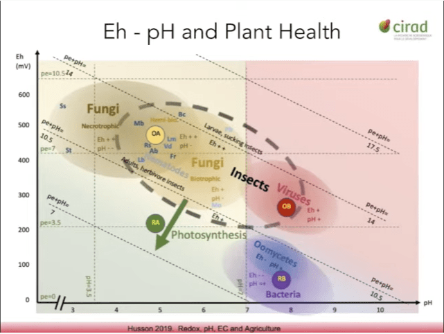 Olivier Husson menciona que las plantas no necesariamente son un recurso para sus bioagresores (para sus patógenos), pero si lo son, es decir, pueden ser consumidas por ellos, únicamente cuando están desequilibradas, especialmente en lo que respecta a Eh (redox), pH y Conductividad Eléctrica. Asimismo, señala que mediante practicas agrícolas, sistemas de cultivo y manejo de la nutrición se pueden modificar estas condiciones bio-físico-químicas en el suelo y las plantas, para que ambos sean desfavoranbles a la presencia de los patógenos.