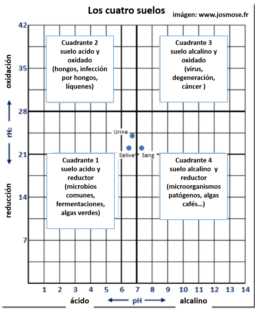 Esto se basa en una investigación realizada originalmente por Louis Claude Vincent en Francia en los años 50´s y 60´s, quien desarrolló una terminología de medición bioelectrónica vegetal, que consideraba la medición de eH, pH y conductividad eléctrica. Originalmente Vincent estaba haciendo observaciones en el agua y en la salud humana, pero luego transfirió esas observaciones a la agricultura y elaboró un diagrama (que se muestra a continuación), en el cual ubicó el valor de pH en el margen inferior y el valor de Eh (redox) en el márgen izquierdo. Después dividió la tabla en 4 cuadrantes que correspondían a diferentes ambientes en el suelo: alcalino y oxidado, alcalino y reducido, ácido y oxidado y ácido y reducido, e identificó que en los distintos cuadrantes se expresan diferentes enfermedades, es decir, hongos versus virus, versus bacterias, etc.