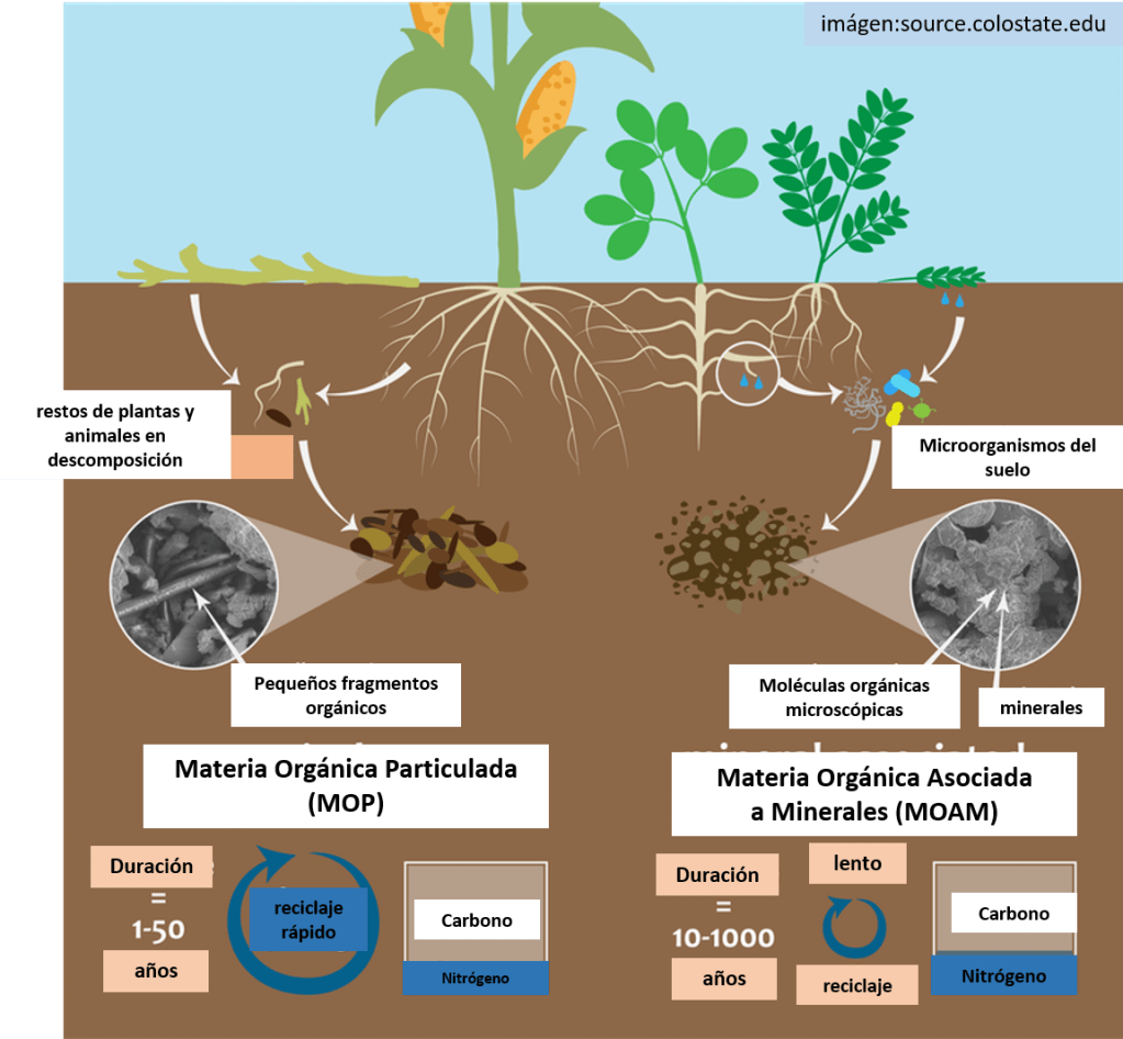 Como se forman y cómo trabajan en el suelo la Materia Orgánica Particulada (MOP) y la Materia Orgánica Asociada a Minerales (MOAM)