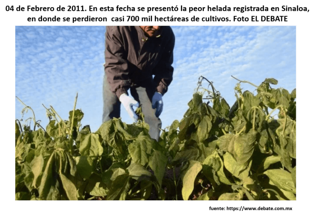 Por ejemplo, la helada extrema que se presentó en el noroeste de México del 2 al 4 de febrero de 2011 afectó principalmente a Sonora, Chihuahua y Sinaloa. Las temperaturas más bajas fluctuaron de -3 °C en tierras bajas (en donde se distribuye el bosque tropical seco – zonas históricamente libres de heladas), hasta -17 °C en las partes montañosas. Los efectos en Sonora fueron los más devastadores, 71 de sus 72 municipios fueron afectados por la helada, y 59 fueron incluidos en la declaratoria federal de emergencia. Agricultores contribuyentes de impuestos de las zonas de cultivo afectadas por la helada, recibieron beneficios fiscales extraordinarios para compensar las pérdidas económicas derivadas de este evento. Es probable que estas pérdidas fueran mayores, porque los efectos de la helada no se cuantificaron más allá de la agricultura.