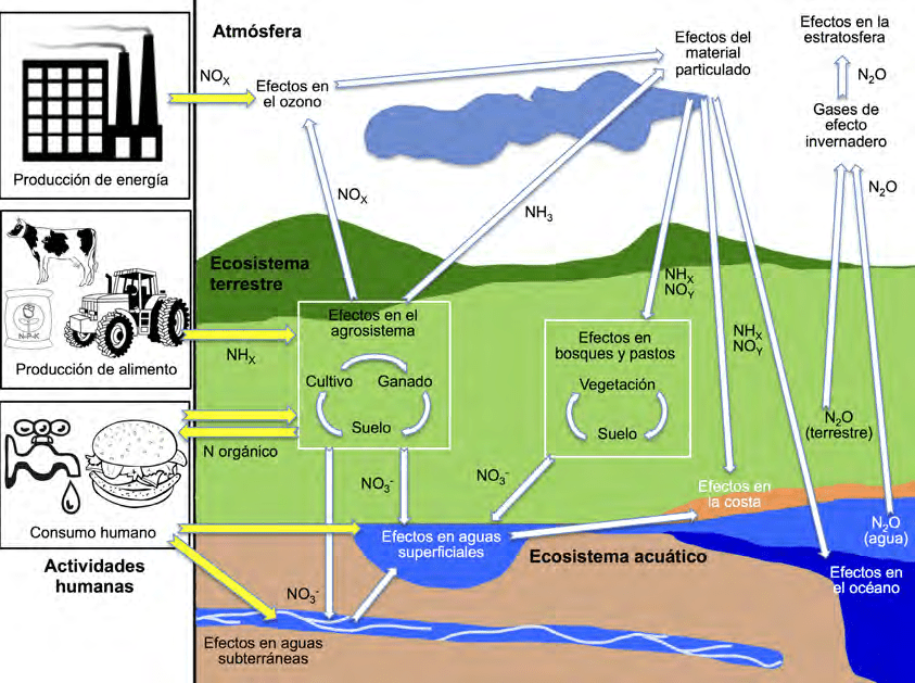 De la combustión de carburantes fósiles se desprende óxido nítrico NO y dióxido de nitrógeno (NO2), compuestos que se conocen genéricamente como NOx. La intensificación de las actividades agrícolas y la combustión de carburantes fósiles aumentan la cantidad de formas reactivas de nitrógeno en el ambiente. Estos compuestos, antes de depositarse en un sumidero final en forma de N2 o quedar inmovilizados en suelos o sedimentos, tienen una serie de efectos en cascada para la salud humana y los ecosistemas, como se puede ver en la siguiente imagen: