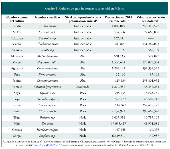 Según el INEGI, muchos de los productos agrícolas que más se producen y que generan grandes beneficios económicos se obtienen gracias a la polinización. En el siguiente cuadro (Cuadro 1) se puede ver el nivel de dependencia de polinizadores de algunos de los productos que se producen en mayor cantidad (toneladas) o que generan una ganancia económica importante para nuestro país a través de la exportación. Cabe destacar que varios de los productos mencionados en esta tabla son originarios de México o se han cultivado en el país desde tiempos prehispánicos; entre ellos están el maíz, el frijol, la vainilla, el jitomate, la calabaza, el aguacate y el cacao.