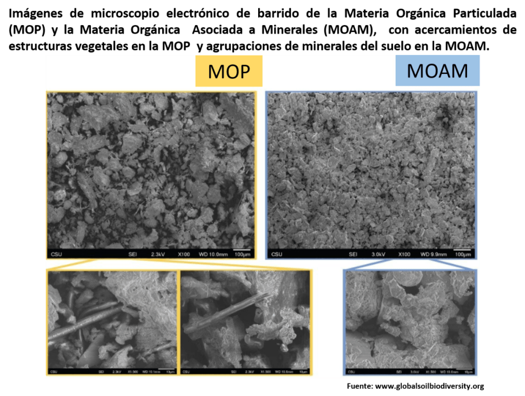 En términos generales, la MOP está constituida en gran parte de pequeños fragmentos que están relativamente sin descomponer, mientras que la MOAM consta de moléculas individuales o fragmentos microscópicos de material orgánico que se han lixiviado directamente del material vegetal o han sido transformados químicamente por la biota del suelo. La diferencia es que la MOAM está protegida de la descomposición a través de la asociación con partículas minerales del suelo, mientras que la MOP no lo está. Las asociaciones minerales incluyen enlaces químicos entre la MOS y superficies minerales, además de la oclusión dentro de microporos o pequeños agregados (<50-63 µm), que hacen que la MOS sea menos accesible para los organismos descomponedores y sus enzimas (Kleber et al., 2015; Kögel ‐ Knabner et al., 2008; Totsche et al., 2018). Debido a esta diferencia fundamental en sus niveles de protección contra la descomposición, la MOAM tiende a persistir por mucho más tiempo que la MOP (Kögel ‐ Knabner et al., 2008; Poeplau et al., 2018; Trumbore & Zheng, 1996).