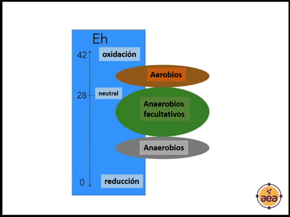 Ahora bien, cuando el Oxígeno entra nuevamente al suelo, se crea un ambiente en el que las bacterias completamente anaerobias, que se ubican en la parte inferior de la escala (ver gráfica de eH), ya no pueden sobrevivir. Así que, lo único que nos queda, las bacterias que ahora consumirán la alfalfa y la usarán como fuente de alimento son las anaerobias facultativas que están en el centro de la escala de la gráfica de eH.