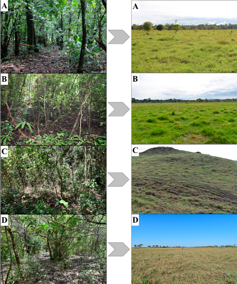 Ejemplos de la conversión de vegetación nativa (a la izquierda) a sistemas ganaderos extensivos (a la derecha) en distintas localidades de la cuenca del río Usumacinta. A) Marqués de Comillas, Chiapas; B) Frontera Corozal, Chiapas; C) Tenosique, Tabasco; y D) Pantanos de Centla, Tabasco. Fotografía T.F. Abbruzzini.