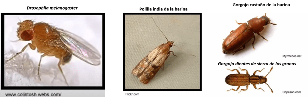 También hay insectos en los productos almacenados, los cuales solo atacan la comida una vez que esta comienza a “morir” y lo pongo entre comillas porque cuando sacas la comida del campo y la colocas en un almacén, en una tolva de almacenamiento de granos o en un silo, se podría decir que en ese punto los alimentos están pereciendo, y es cuando este tipo de insectos entran en acción.  Hay cursos de entomología a nivel universitario, que se enfocan específicamente en este grupo de insectos, entre los que se encuentran, la polilla india de la harina (Plodia interpunctella), que es la plaga número 1 de los productos almacenados en el mundo, el gorgojo castaño de la harina (Tribolium castaneum) y el gorgojo de dientes de sierra de los granos (Oryzaephilus surinamensis). Todas estas importantes plagas de los productos almacenados, no los atacarán en el campo, es decir, la mayoría de las veces no lo harán, hay muy pocas excepciones.