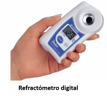 Las mediciones obtenidas con un refractómetro de Brix son un indicador confiable. Para quienes no están familiarizados con este instrumento, hay dos tipos de refractómetros: el manual (imagen del lado izquierdo), en el cual se coloca una gota de savia en la pantalla y se observa a través del ocular para obtener la lectura, y el digital, que tiene mayor tecnología y nos da la posibilidad de hacer una medición mas precisa, por ejemplo, diferenciar entre 12.2 y 12.3 brix; lo que no es tan necesario porque si tenemos esos valores, podemos decir que ya ganamos.
