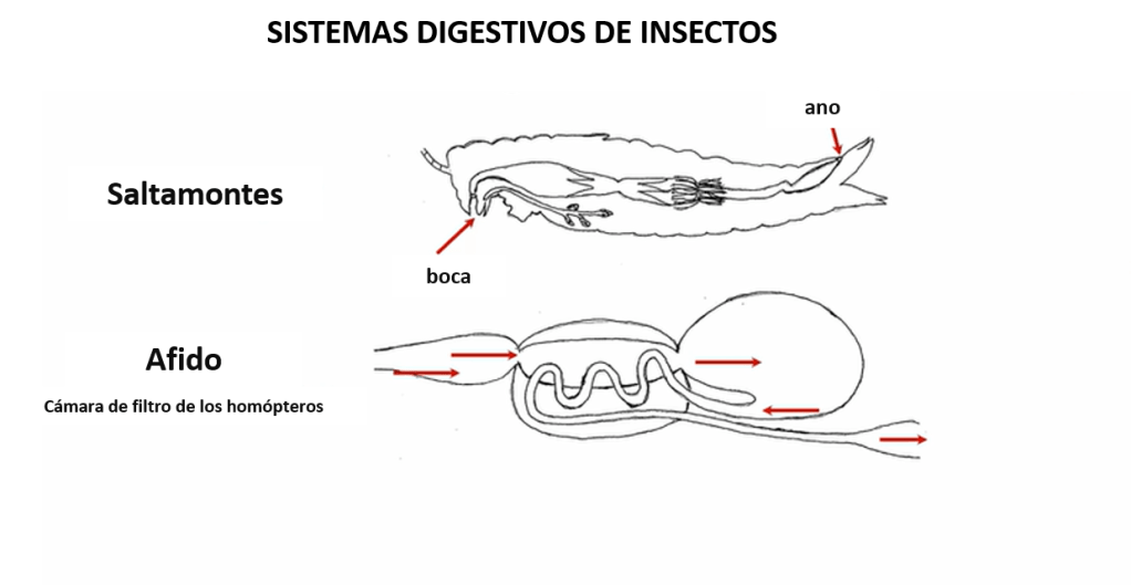 Este sistema digestivo unidireccional es el que tienen la mayoría de los insectos, sin embargo, no es el caso de los áfidos. Los homópteros (en los que se incluyen los áfidos) tienen un sistema un poco diferente. La comida entra y avanza de forma unidireccional después de que se ingiere, como lo indican las flechas en la siguiente ilustración, pero sucede algo extraño, este sistema digestivo se pliega sobre sí mismo, lo que no ocurre con el de los saltamontes y la mayoría de los otros insectos. Debido a esto, podemos decir que hay un mecanismo establecido para eludir muchos de los nutrientes que están ingresando, de esta forma, los nutrientes que son requeridos, pueden absorberse directamente en el intestino posterior y el resto salir por la parte trasera como desecho. Esta es la razón por la que los áfidos y otros homópteros excretan principalmente azúcar.