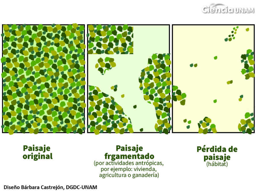 Por su parte, la fragmentación, que a veces se confunde con pérdida de hábitat, está más bien relacionada con el grado de rotura del hábitat, el cual queda distribuido por todo el paisaje en pedazos (fragmentos) que pueden ser de diferentes tamaños y en donde pueden vivir distintas especies.