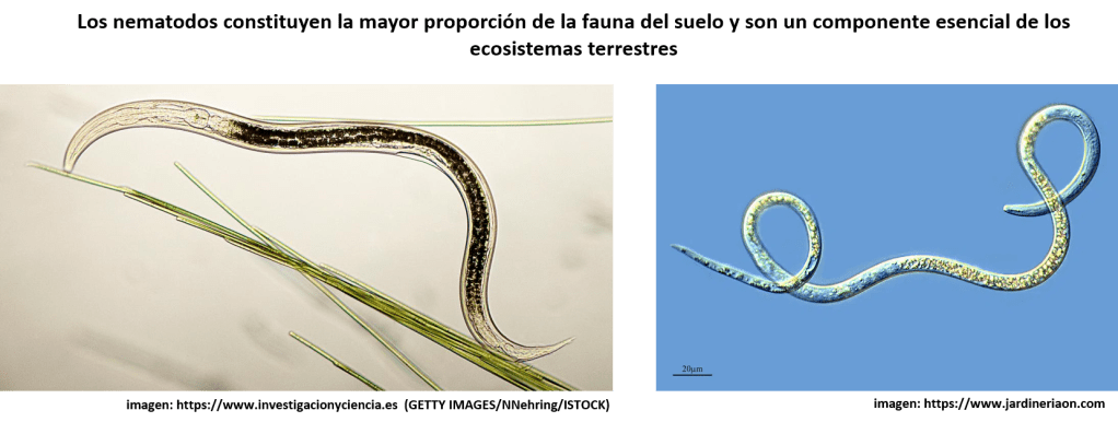 Son gusanos no segmentados generalmente de 50 micrones (µm) de ancho y 1 mm de largo. Los nematodos son ubicuos dentro de los suelos, donde con frecuencia superan en número a todos los demás organismos, tanto en especies, como en porcentaje poblacional. Poseen un sistema nervioso central, un tracto digestivo y un sistema reproductor, por lo que se les considera los organismos más primitivos. Al ser organismos acuáticos, requieren de una humedad adecuada en el suelo para moverse con eficacia. Algunos son parásitos de las plantas, por lo que frecuentemente se les presta especial atención, sin embargo, la gran mayoría de los nematodos no parasitan las plantas.