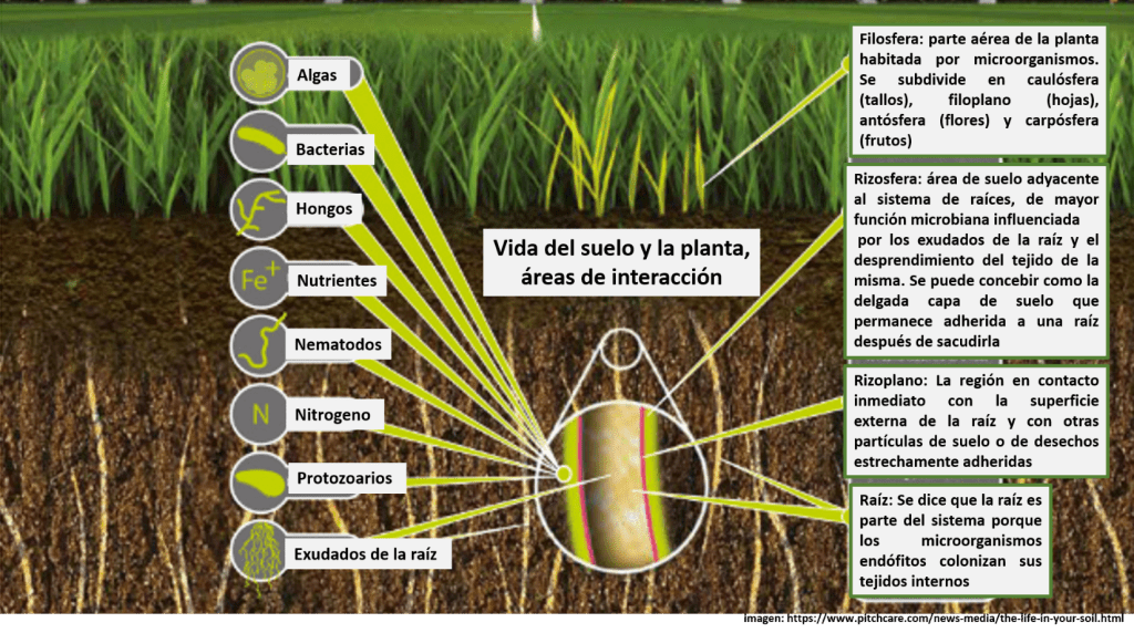 La interacción entre los microorganismos y las raíces de las plantas dentro de estas regiones es una actividad asociativa mutuamente benéfica.