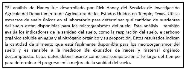 Hemos estado haciendo el Analísis de Haney durante los últimos dos años. Todavía estamos adquiriendo experiencia en su utilización, es decir estamos desarrollando más datos, sin embargo, lo que se ha vuelto evidente en este tiempo es que el Análisis de Haney* se correlaciona mucho mas considerablemente con la absorción real de nutrientes por parte de las plantas que se reporta en el análisis de savia, que lo que se reporta en el análisis de suelo basado en la CIC. Asimismo, se correlaciona con la respuesta del cultivo, mucho más de lo que lo hace el análisis de suelo. De ahí que, si se adopta una perspectiva diferente, en base a un enfoque diferente adicional, las recomendaciones agronómicas, las recomendaciones de productos y las recomendaciones de fertilización cambian.