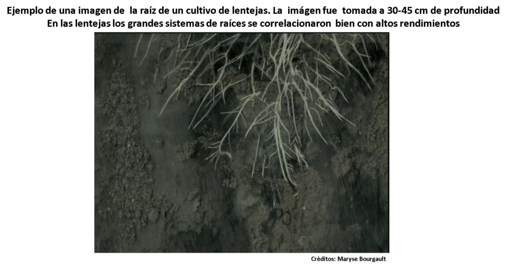En lentejas, sistemas de raíces grandes se correlacionaron bien con altos rendimientos. «Las plantas de lentejas tienden a ser pequeñas, por lo que los mejoradores han estado tratando de hacerlas más grandes y altas», dice Bourgault. «Si estamos presionando para tener plantas de lentejas más grandes, también deberíamos hacer selección para sistemas de raíces de lentejas más grandes».
