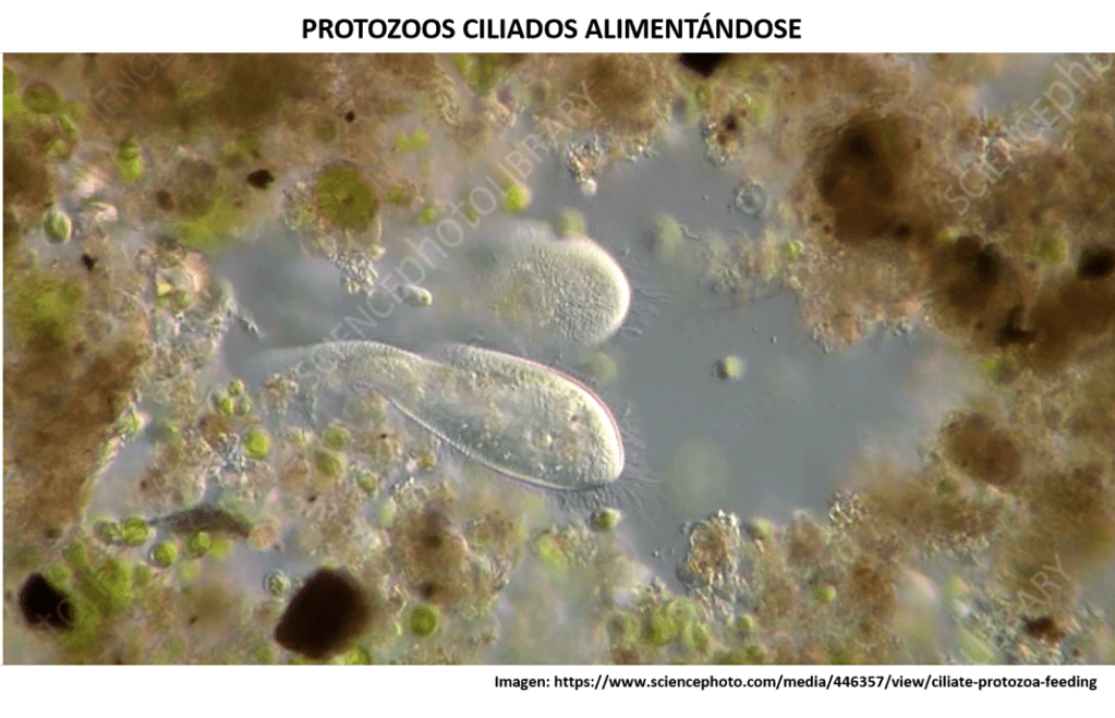 Los protozoos son criaturas clave, son responsables de reciclar el Nitrógeno a partir del contenido de dicho elemento que se encuentra en el cuerpo de las bacterias que consumen. Las bacterias tienen una relación Carbono/Nitrógeno de 5:1, lo que significa que aproximadamente el 17 % de sus diminutos cuerpos están compuestos de Nitrógeno. Los protozoos tienen una relación Carbono/Nitrógeno de 30:1. Entonces un protozoo necesita comer 6 bacterias con proporción C/N de 5:1, para cubrir sus requerimientos continuos de Carbono (30). Sin embargo, solo requiere de 1 de las 6 unidades de Nitrógeno para satisfacer sus necesidades de este elemento. Por lo tanto, el protozoo expulsa 5 moléculas del Nitrógeno no deseado al suelo. ¡Esto es excelente para la planta!