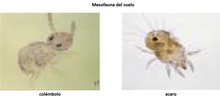 Los colémbolos y los ácaros son Mesofauna que comúnmente se encuentra en el suelo. Desempeñan un papel importante en la descomposición de la materia orgánica, el reciclaje de nutrientes y la regulación de las poblaciones microbianas por depredación.