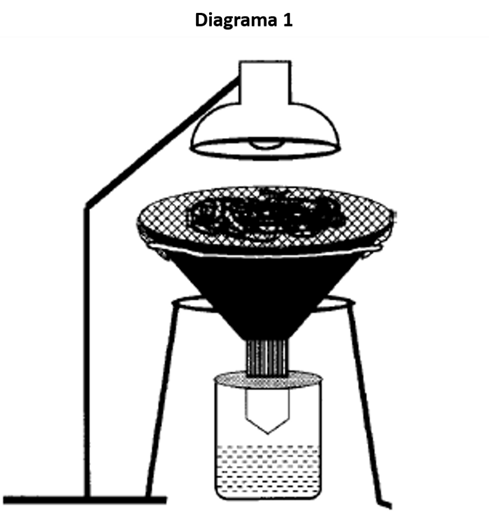- Colocar el embudo dentro del vaso de precipitado, la parte inferior del embudo debe quedar encima de la superficie del etanol (ver diagrama 1). Para sostener el embudo de esta forma, es posible que se necesite una abrazadera o bien un tripie.