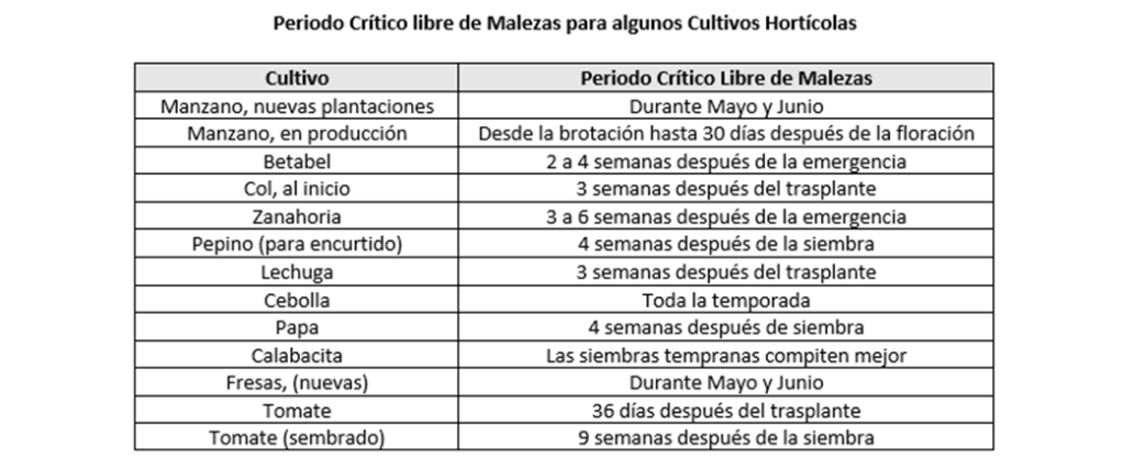 Los cultivos hortícolas son muy susceptibles a la competencia de malezas y deben mantenerse libres de ellas, desde la siembra (o trasplante), la emergencia (o la brotación), hasta el final de su “período crítico libre de malezas”.
