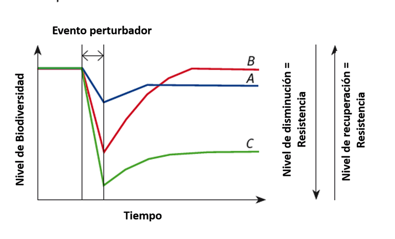 - La comunidad B muestra niveles relativamente bajos de Resistencia, pero niveles mucho más altos de Resiliencia y poco después del evento de perturbación vuelve a funcionar a los niveles previos a dicho evento.