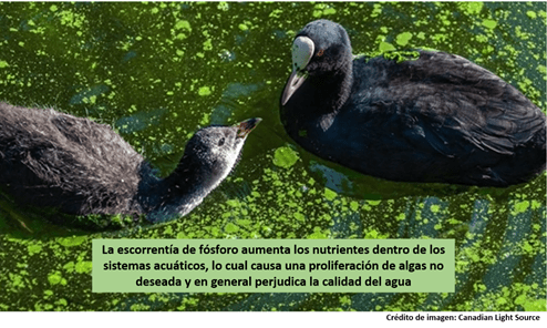 El fósforo es un nutriente esencial para los cultivos y un componente de muchos fertilizantes y abonos, incluido el estiércol. Si bien es fundamental para el crecimiento de las plantas, demasiado puede dañar la calidad de los cuerpos de agua cercanos a las granjas. La escorrentía de fósforo aumenta los nutrientes dentro de los sistemas acuáticos que alimentan la proliferación de algas, lo que puede provocar una disminución del agua oxigenada y una reducción de la diversidad biológica en los lagos. La proliferación de algas puede afectar la salud humana y la vida silvestre, así como las economías de las comunidades afectadas que dependen de la pesca y el turismo.
