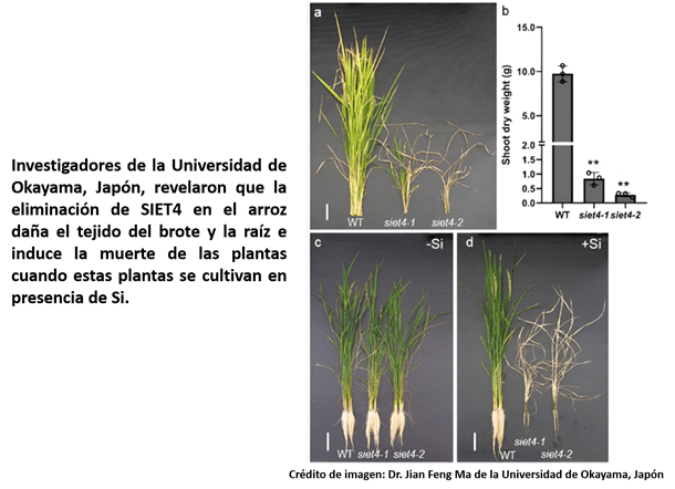 El equipo utilizó una serie de experimentos para comprender el papel de SIET4 en la acumulación de Silicio en las hojas. Estos incluyeron la generación de mutantes “knockout” (en los que se destruye un gen objetivo) y la caracterización funcional de SIET4 para comparar los perfiles de transcripción del arroz de tipo silvestre (WT) y los mutantes de SIET4. El equipo también describió la actividad de transporte y la localización celular de SIET4. «Confirmamos que SIET4 codificaba un transportador de Silicio y se expresaba constitutivamente en hojas de arroz WT. Además, el transportador estaba confinado al lado distal de las células epidérmicas y buliformes (que ayudan a enrollar las hojas para evitar la pérdida de agua) de la lámina de la hoja». dice el Dr. Ma. A diferencia del arroz WT, las plantas que carecían de SIET4 mostraron un crecimiento inhibido y finalmente murieron cuando se cultivaron en presencia de Silicio en la solución nutritiva y el suelo.