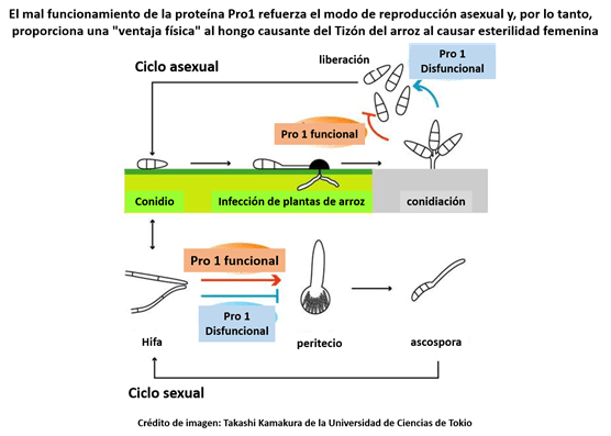 El Dr. Arazoe agrega: «Para nuestra sorpresa, el Pro1 disfuncional aumentó la liberación de conidios pero no afectó la patogenicidad de P. oryzae. También encontramos mutaciones Pro1 en aislados que infectan el trigo, que se teme que se propaguen por todo el mundo (pandemia), un hallazgo que sugiere que ha ocurrido una evolución similar (pérdida de la reproducción sexual) en el hongo del tizón del trigo». Sobre la base de estos resultados, el grupo de investigación ya está encabezando la identificación y caracterización de otros genes que causan la esterilidad femenina en especies de hongos.