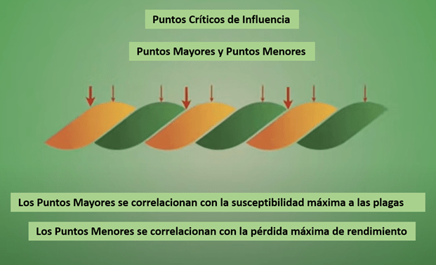 Entonces, el posicionamiento óptimo de los bioestimulantes a fin de obtener la mayor respuesta económica del cultivo, es justo en los períodos de máximo estrés en la planta; esto es cuando se encuentra en transición de un ciclo de crecimiento vegetativo a uno de crecimiento reproductivo. Esto es lo que llamamos Puntos críticos de influencia.