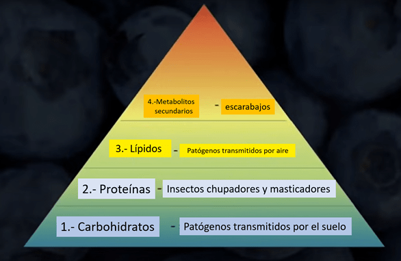 Después, alcanzamos el tercer y cuarto nivel de la Pirámide cuando las plantas comienzan a producir niveles más altos de lípidos, grasas, aceites y metabolitos secundarios como las fitoalexinas, los terpenoides, sesquiterpenos y bioflavonoides. Todos estos son compuestos que las plantas producen en concentraciones mas altas y esto es la Inmunidad Activa.