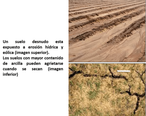 El aumento de la sequía y el calor reducen la capacidad de las plantas para subsistir, lo que podría dejar los suelos desnudos y expuestos a la erosión y dar lugar a una serie de pérdidas de los animales del suelo que dependen de las plantas para su alimentación y hábitat. La inestabilidad general o imprevisibilidad de las temperaturas estacionales afectará las épocas de floración y los ciclos de vida de insectos y microorganismos. El aumento del nivel del mar aumentará el riesgo de inundaciones en las zonas costeras, donde las inundaciones con agua salada serán un problema para la sanidad del suelo y la productividad de las tierras agrícolas.