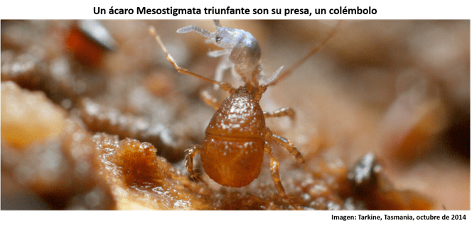 DE QUE SE ALIMENTAN: Los ácaros oribátidos consumen bacterias, hongos, algas, y plantas y animales muertos, mientras que los ácaros del orden Mesostigmata se alimentan de huevos y larvas de insectos, otros ácaros, colémbolos y nematodos.