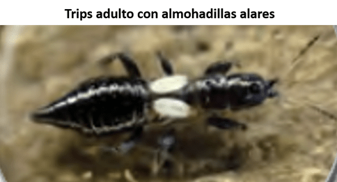 DESCRIPCIÓN: Los trips tienen cuerpos pequeños, delgados y oscuros y cabezas cónicas con piezas bucales que perforan y succionan y antenas cortas. Las alas, cuando están presentes, son largas y muy estrechas filiformes o moniliformes.