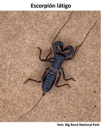 DESCRIPCIÓN: Todos los escorpiones tienen cuerpos segmentados, ocho patas, un par de quelíceros y un par de pedipalpos. Los escorpiones verdaderos (escorpiones) tienen una cola que termina en un aguijón venenoso, que a menudo llevan sobre la espalda, y pedipalpos que terminan en pinzas. Los escorpiones de viento (Solifugae), también conocidos como arañas camello, tienen un abdomen redondeado, no tienen aguijón, y utilizan sus grandes pedipalpos para atrapar presas. Los escorpiones de viento, los escorpiones látigo (Thelyphonida), los escorpiones látigo sin cola (Amblypygi) y los escorpiones látigo de cola corta (Schizomida) corren sobre sus tres patas traseras y usan el par de patas delanteras como sensores. Los escorpiones látigo se parecen a los escorpiones verdaderos, pero tienen una cola larga y delgada. Los escorpiones látigo sin cola tienen patas muy largas, no tienen cola y tienen pedipalpos modificados para agarrar. Los escorpiones látigo de cola corta tienen patas traseras modificadas para saltar y una cola corta que se extiende desde su abdomen.