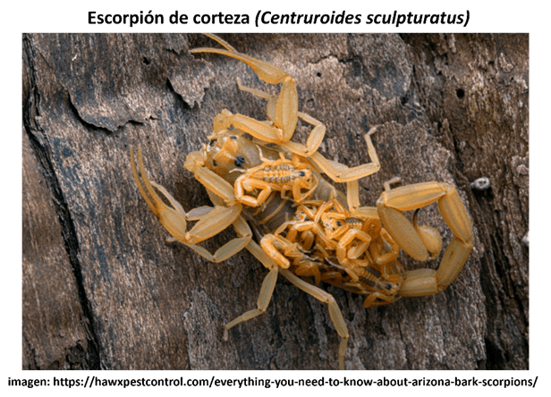 CICLO DE VIDA: Los escorpiones verdaderos dan a luz crías vivas y las llevan sobre su espalda durante varias semanas. Las hembras adultas de otros escorpiones también brindan cuidados maternales. Algunas especies pueden cavar madrigueras profundas bajo tierra donde ovipositan. Otras pueden llevar los huevos en sacos en el abdomen o permanecer en una cámara con ellos hasta que eclosionan. Los escorpiones crecen lentamente y pueden tardar varios años en alcanzar la madurez. Pueden vivir de tres a diez años, o incluso hasta quince.