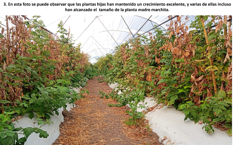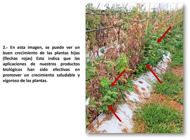 En las siguientes imágenes se observa el proceso de recuperación de una huerta de frambuesa orgánica a través del tiempo. La huerta había sido afectada por Botrytis sp. y Phytophthora sp. Las plantas, que antes parecían marchitas, rebrotaron con vigor. Los nuevos brotes se desarrollaron rápidamente, produciendo flores y frutos eventualmente, devolviendo así la productividad a la huerta. El tratamiento se realizó mediante aplicaciones por el sistema de riego y aspersión foliar con las nuevas versiones de Q Bacter y Fungi Q.