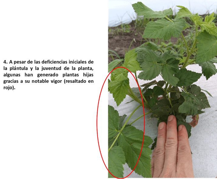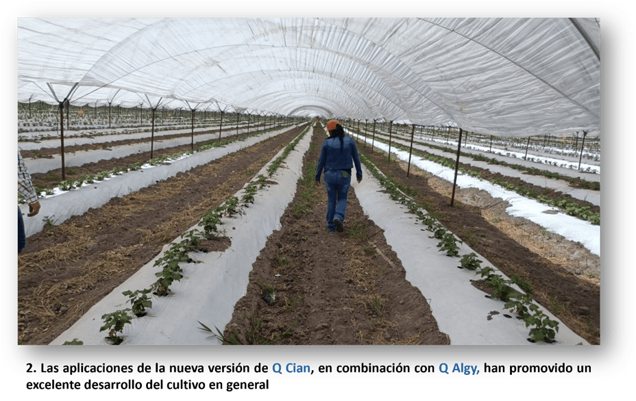 En las siguientes imágenes, se aprecia el proceso de recuperación de una huerta de frambuesa orgánica de nuevo trasplante. La huerta recibió un lote de plántulas de calidad deficiente, con signos de etiolación y envejecimiento. Se realizaron aplicaciones mediante el sistema de riego y aspersión foliar de una mezcla de la nueva versión de Q Cian, en combinación con Q Algy.