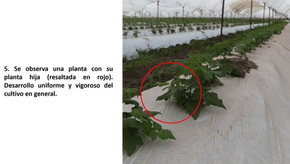 Gracias a los efectos de estas aplicaciones, se observa cómo los nuevos brotes presentan tallos más gruesos, sin síntomas de lignificación, y hojas de gran tamaño. Además, se nota un desarrollo uniforme y vigoroso en toda la huerta. Incluso algunas plantas han generado plantas hijas.