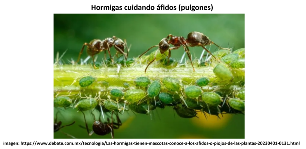 • Algunas hormigas cuidan colonias de áfidos(pulgones), protegiéndolas de los depredadores a cambio de obtener un líquido pegajoso rico en azúcar llamado “honeydew” (exceso de savia que secretan los áfidos como desecho), y transportarán áfidos de la raíz a las raíces recién brotadas.