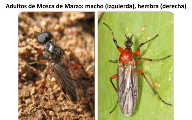 CICLO DE VIDA: Los adultos emergen en masas y tienen una vida corta. Las hembras vuelan dentro de enjambres de machos para encontrar pareja, y las moscas apareadas permanecen unidas a sus compañeros durante un día o más. Las hembras cavan una pequeña cámara en el suelo para poner sus huevos.