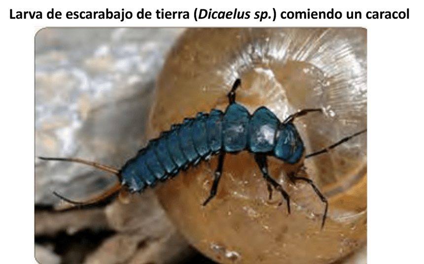 IMPORTANCIA ECOLÓGICA: Los escarabajos de tierra encajan de varias maneras en las redes alimentarias del suelo. Como larvas y adultos son depredadores, y en los sistemas agrícolas son contribuyentes importantes en el control de plagas de los cultivos. Algunas especies también comen detritos, hongos y semillas de plantas.
