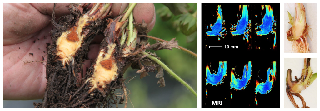 El estudio empleó varios métodos cuantitativos de imágenes por resonancia magnética para investigar los cambios inducidos por infecciones en las coronas de fresa. Estos valores cuantitativos dan una indicación indirecta de la integridad de las estructuras celulares de las plantas, lo que permite comparar plantas infectadas y sanas sin dañarlas. Esto permite el seguimiento y la evaluación a largo plazo de la progresión de la enfermedad.