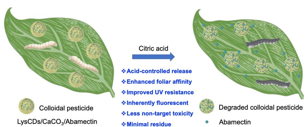 Cuando el pesticida entra en contacto con el ambiente débilmente ácido de las hojas de las plantas, el carbonato de calcio se descompone, facilitando una liberación más rápida del pesticida y permitiendo un seguimiento más fácil a través de la fluorescencia emitida por los puntos de carbono.