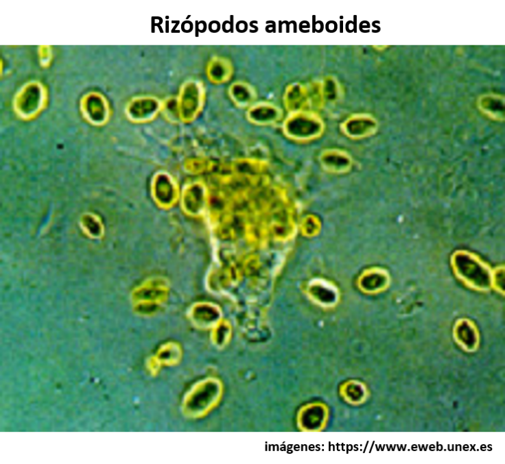 Rhizopoda: generalmente sin apéndices, pero puede haber pseudópodos (pies temporales). Normalmente presentan protoplasma desnudo sin pared celular, ejemplo, Amoeba spp.